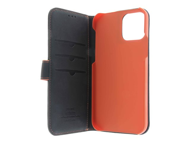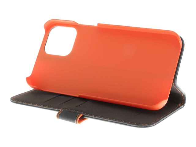 Insmat - Vikbart fodral för mobiltelefon - genuint läder, papper, polykarbonat, kartong, polyuretanklädsel - svart, orange - för Apple iPhone 12, 12 Pro 650-2969
