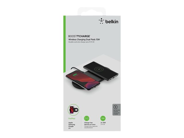 Belkin BoostCharge Dual - Trådlös laddningsplatta + växelströmsadapter - 15 Watt - svart - för Apple iPhone 11, 11 Pro, 11 Pro Max, 8, 8 Plus, X, XR, XS, XS Max; Samsung Galaxy Note10, Note10+, S10, S10+, S10e