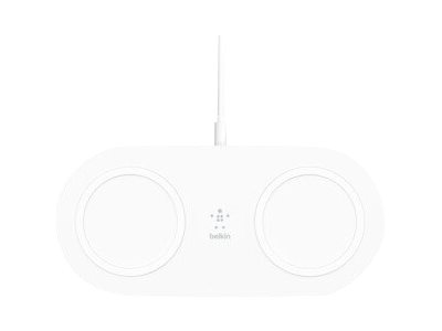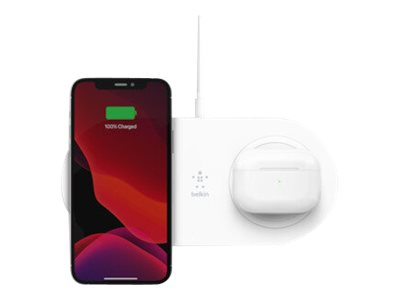 Belkin BoostCharge Dual - Trådlös laddningsplatta + växelströmsadapter - 15 Watt - vit - för Apple iPhone 11, 11 Pro, 11 Pro Max, 8, 8 Plus, X, XR, XS, XS Max; Samsung Galaxy Note10, Note10+, S10, S10+, S10e