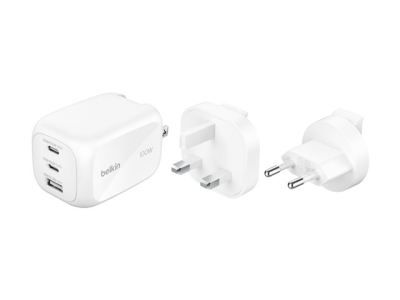 Belkin BoostCharge Pro - Strömadapter - GaN - 100 Watt - PD 3.1/PPS - 3 utdatakontakter (2 x USB-C, USB) - vit - med reseadapterkit WCH016HQWH