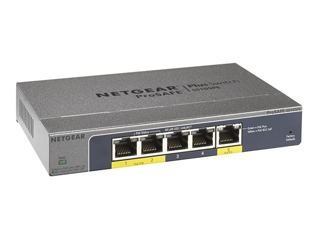 NETGEAR Plus GS105PE - Switch - Administrerad - 2 x 10/100/1000 (PoE+) + 3 x 10/100/1000 - skrivbordsmodell - PoE+ (19 W)
