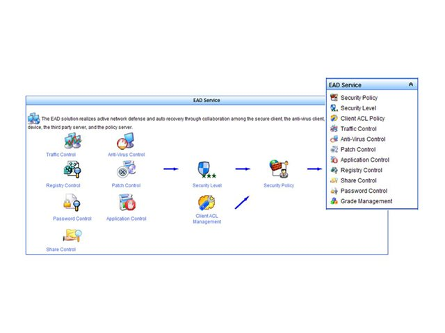 EAD reduces the risk of malicious code infections or other security breaches by detecting endpoint patches, viruses, Address Resolution Protocol attacks, abnormal traffic, the installation and running of sensitive software, as well as the status of system services. EAD provides continual monitoring of endpoints. The software now supports a concurrent licensing model.