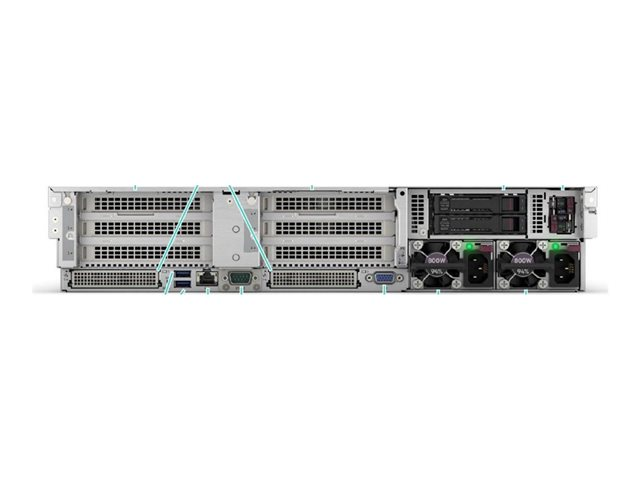 | Gränssnitt | 1 x HPE iLO (1 på framsidan) (service port) 5 x USB 3.2 Gen 1 (1 fram, 2 bak, 2 interna) 1 x VGA 4 x LAN (Gigabit Ethernet) |