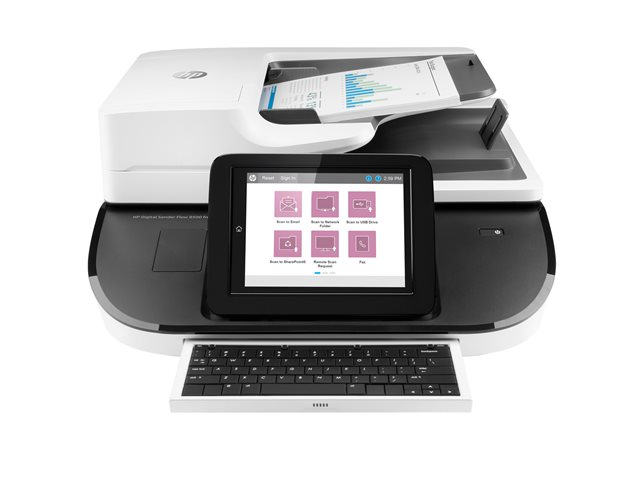 | Funktioner för skanner | Skanna till portabel USB-enhet, Automatic Image Orientation, automatisk färgdetektering, Auto Crop, inbyggd High Performance Secure-hårddisk, 8-tums pekskärms-TFT-display, Ultrasonic Multi Feed Detection, inbyggt tangentbord, Hardware Integration Pocket (HIP), HP EveryPage, OCR Text Recognition |