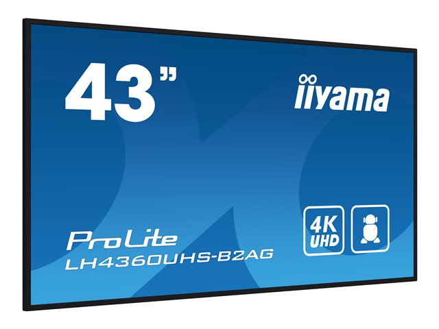 The iiyama ProLite LH4360UHS-B2AG offers a 43-inch 4K UHD LED-backlit LCD flat panel display designed for commercial use. With a resolution of 3840 x 2160 and a brightness of 500 cd/m2, this display ensures stunning visuals that captivate any audience. It features a wide viewing angle of 178°, making it suitable for digital signage in both portrait and landscape modes. This display is built for reliability with a 24/7 operation capacity and an MTBF of 50,000 hours, ensuring minimal downtime for commercial environments. Equipped with built-in speakers delivering a total output power of 20 watts, it also incorporates advanced features like anti-image retention and Signal Failover to enhance performance. The iiyama ProLite LH4360UHS-B2AG is designed with a fanless architecture and a thin bezel, offering a sleek appearance that fits seamlessly into any setting.