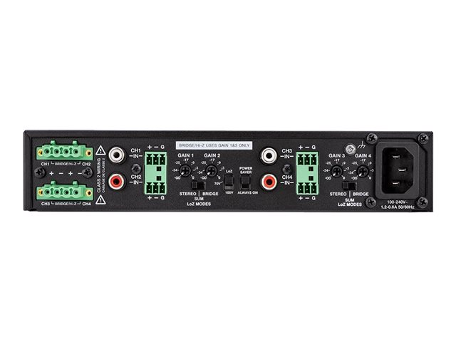 | Specifikationer för förstärkarutmatning | 150 Watt - 8 ohm - 1 kanaler 200 Watt - 4 ohm - 1 kanaler 150 Watt - 8 ohm - 2 kanaler 150 Watt - 4 ohm - 2 kanaler 75 Watt - 8 ohm - 3 kanaler 75 Watt - 4 ohm - 3 kanaler 75 Watt - 8 ohm - 4 kanaler 75 Watt - 4 ohm - 4 kanaler 300 Watt - 8 ohm - 1 kanaler (bryggad) 150 Watt - 8 ohm - 2 kanaler (bryggad) 300 Watt - 1 kanaler (70V) 300 Watt - 1 kanaler (100V) 150 Watt - 2 kanaler (70V) 150 Watt - 2 kanaler (100V) |