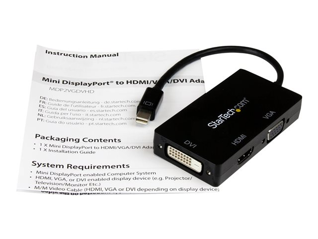 StarTech.com A/V-reseadapter: 3-i-1 Mini DisplayPort till VGA-, DVI- eller HDMI-konverterare - Videokort - Mini DisplayPort hane till HD-15 (VGA), DVI-D, HDMI hona - 27 cm - svart - aktiv, 1920 x 1200 (WUXGA) stöd - för P/N: DKT31CMDPHPD MDP2VGDVHD