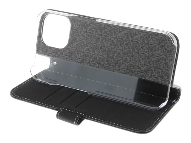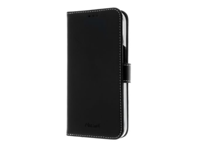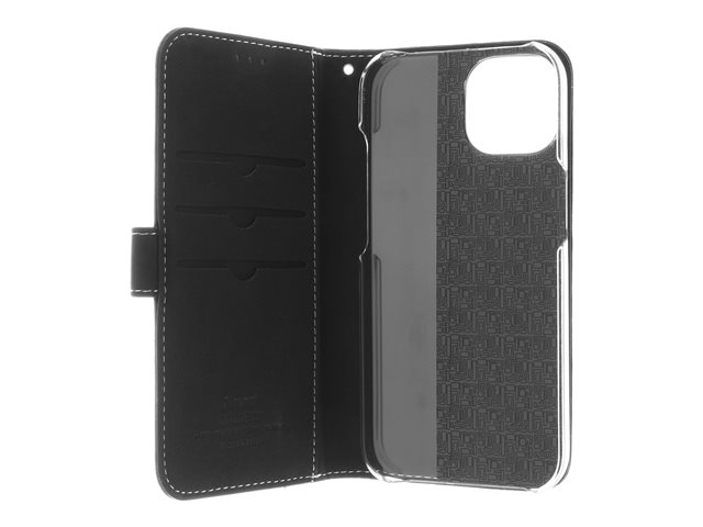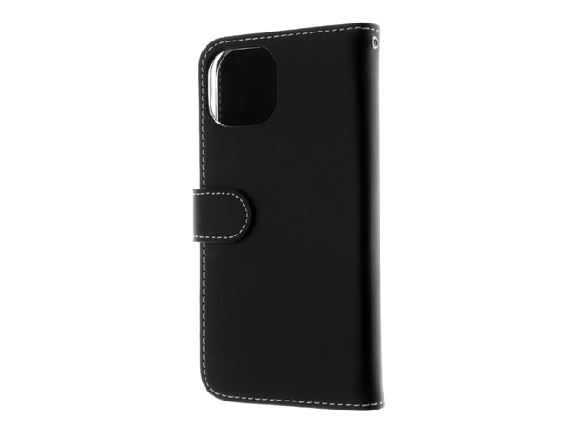 Insmat Exclusive - Vikbart fodral för mobiltelefon - genuint läder, polykarbonat, kartong+papper+aluminiumfolie, bomullssömmar - svart - för Apple iPhone 15