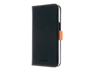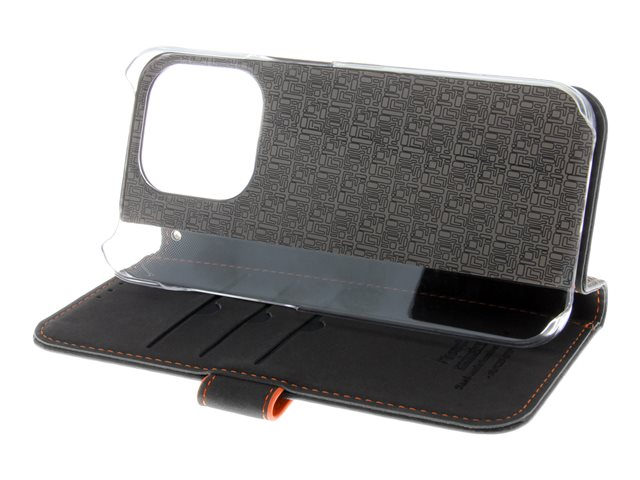 Insmat Exclusive - Vikbart fodral för mobiltelefon - genuint läder, polykarbonat, kartong+papper+aluminiumfolie - svart, orange - för Apple iPhone 15 Pro 650-3194
