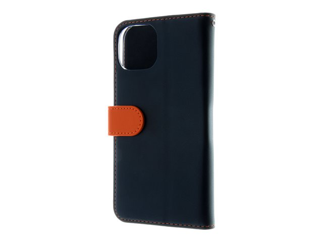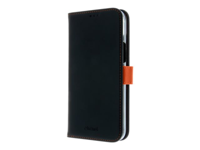 Insmat Exclusive - Vikbart fodral för mobiltelefon - genuint läder, polykarbonat, kartong+papper+aluminiumfolie, bomullssömmar - svart/orange - för Apple iPhone 15 Plus