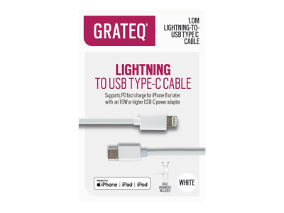 GRATEQ - Lightning-kabel - 24 pin USB-C hane till Lightning hane - 1 m - vit - Strömförsörjningsstöd