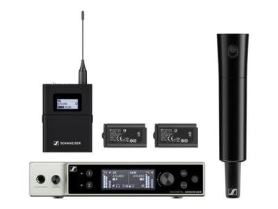 Förpacknings innehåll | EW-DX SK sändare för ryggsäck, EW-DX SKM-S handhållen sändare, EW-DX EM 2 rackmonterad mottagare, 2 x BA 70 rechargeable batteries, mikrofonklämma, 2 stångantenner, GA 3 rackmonteringssatspaket, 4 gummifötter |